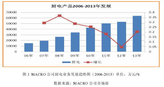 MACRO 是一家专业从事清洁能源(燃气)高效利用,以产品和服务为核心价值的低碳、智慧型企业。公司成立于 1988 年,厨房及关联产业(整套厨电、集成橱柜、生活电器、空气净化器)作为其核心支柱产业,为客户提供厨房的产品及整体系统解决方案。 公司始终贯彻“技术领先战略”,坚持以技术创新引领行业发展,积累了雄厚的技术实力。公司还作为企业代表,主导起草了近 50 项国家、行业、地方标准,包括《家用燃气灶具》国家标准、《中国菜厨电选择标准》等行业标准,推动了中国厨电技术的全面升级。 在集团“2020 年百亿工程”战略规划的指引下,公司厨电价值主张“中国菜厨电专家”,市场定位做中高端厨电,以技术创新、产品结构优化为切入点,规划厨电产品及技术,稳定质量、提升工艺基础,以规划和预算为核心工具,通过完善组织架构、人员梯队建设、提升队伍能力,完成厨电业务战略目标,实现公司厨电业务的跨越式发展,成为行业领先企业。 MACRO 公司厨电产品主营油烟机、灶具、消毒柜三大品类,近 10 年业务保持 20%以上平均增长(图 1),销售额和销量市场占有率排名行业 5-6 位。