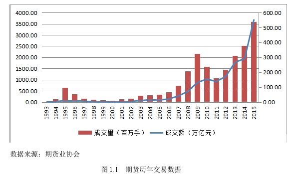 根据中国期货市场历史成交数据统计(图 1.1),可以发现中国期货市场是经历了快速增长后萧条,继而稳步增长。中国引入期货以来,中国期货行业经历了 4 个发展阶段。1993 年~1995 年,由于缺乏监管以及国内对期货行业的认知空白性,期货行业产生虚假繁荣,这段增长与不规范的地下交易和恶性投资直接相关。1996 年~2001 年,由于不规范的运作,期货行业产生了多起事故,国家对期货行业进行规范整顿,期货交易所由最初十四所减少到三所,期货公司由三百多家缩减至不足两百家,成交量额从 1995 年的峰值萎缩到底部。2001 年~2010 年,规范整顿后,随着对期货产品的重新认知,政府对期货行业的发展采取了政策性支持,期货市场的成交量、额稳步增长。2010 年股指期货上市,中国自此开始有了金融期货产品,期货市场发展有了质的突破。期货市场的买卖双向性、交易费用低、杠杆作用大等交易特征,使投资者可以在期货市场进行投资或投机活动。相较于股票市场只能先买入再进行该股票的卖出,期货市场能够双向操作,既能够买入期货合约做多,也可以卖出期货合约做空。期货合约价格进行向上或向下波动,投资者均能够找到机会,获得盈利。在中国刚引入期货市场时,一方面由于国家担心期货市场交易者少,期货交易不活跃,另一方面国家对期货市场监管处于空白区,所以使得大量的投机商参与,这些投机商无货沽空,进行大量投机行为,导致期货市场异常混乱,甚至带来整个经济市场的动荡。 随着政府对期货市场的“降温”以及对期货市场的重新认知,期货市场的本质被重新重视并接受。1848 年,82 位芝加哥的商人作为发起人,促成芝加哥期货交易所建立、期货交易的诞生。当初创建期货市场的目的是为了规避谷物在未来某一时间价格变动的不确定性。发起人的身份说明了期货交易的根本就是为现货贸易进行补充、服务的。现货是即时的买卖,期货是未来的交易,两者没有本质的区别,增加期货市场之后,买卖双方在对期货和现货市场进行比较后,能够选择价格更有优势的市场进行交易。 对期货的本质和作用有了重新的认识之后,政府不再一味制止期货发展,开始出台政策鼓励期货市场健康发展。而出于对期货本质的接受以及对其规避价格风险的认知,以现货为背景的集团企业对期货市场产生了需求。现货企业虽然了解现货的属性,但是因为现货是以固定方法去处理,而期货有着其与现货不同的金融属性,同时还有着市场上的过度炒作的特色,所以如果将现货的固有思维直接搬到期货市场上,不仅仅做不好风险规避,反而会产生不必要(不涉及期货市场)的亏损。在这种政府鼓励、现货企业激发需求的背景下,期货公司开始重视对于产业客户服务的研究。