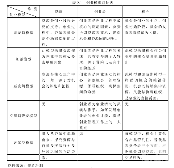 创业现象起步较早,开始于 18 世纪,但得到快速发展的时间实在 20 世纪 80年代,创业现象得到越来越多人的关注,并激发了研究热潮。在这些研究中,一些学者提出了很多独特的见解和经典的模型,比如蒂蒙斯(Timmons)创业学模型、克里斯蒂安(Christian)的创业学模型、加纳(Gartner)创业学模型、佐拉(Zahra)和乔治亚(George)的创业模型等已成为创业学研究的主要理论依据,本节主要对这些经典模型进行梳理和比较。 要对这些模型进行比较,首先要建立一个维度,及从哪些方面进行对比。本人拟从资源、机会和创业者三个维度来比较创业模型间的异同点,已期能够找出模型之间的异同点,更深入的了解这些模型。 根据基于机会、创业者及资源三个维度对国内外创业模型和比较,我们发现了模型之间的一些异同点: 首先、所有模型均是动态的,在动态中实现了各个创业要素的联系。 其次、蒂蒙斯模型中,克里斯蒂模型所强调的创业者与新事业的互动,其内涵正好可以蒂蒙斯模型的机会、资源、团队三要素的互动关系加以说明。而蒂蒙斯模型强调创业系统的动态平衡问题,克里斯蒂模型则是以重视创业流程管理来表现。而创业者被普遍认为是创业过程中最为核心的因素。在蒂蒙斯、加纳、克里斯蒂、威克姆等模型中都认为创业者是创业过程的决定性因素,维持了资源、机会及环境之间的协调发展,确保创业的顺利开展。 最后,国内创业模型源于国外的经典模型,但却是基于中国情景的,具有典型的国家特性和民族特性。