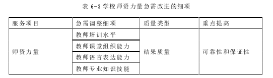 本文针对 D 机构教育服务改进出了四个具体的改进方向:(1)资源再配置;(2)再学习;(3)服务方式改进;(4)提高标准化要求。 在此基础上将各服务要素划分到不同的服务改进方向之中具体服务要素改进方式归类见表 6-1: 确定各服务要素的具体改进方向以后,我们需要对各服务要素进行改进完善等级划分,以确定各服务要素进行服务改进完善的次序。我们依据之前得出的各服务要素综合重要度得分作为划分其改进完善等级的参考标准,参照各服务要素得分的分层情况,对各服务要素改进完善等级具体划分标准规定如下: 综合重要度得分大于-0.1 分的服务要素,划分为优先改进完善;综合总要度得分大于-0.01 小于-0.1 的服务要素,划分为次改进完善;综合重要度得分小于-0.01 分的服务要素,划分为可以待改进完善。 我们知道商业运营过程中的顾客对服务过程和结果的满意度可以用五个维度来评价,即可靠性、有形性、响应性、保证性、移情性方面来评价,在此我们结合这五个维度来分析教育培训机构服务质量,以便系统全面的提高。下文将结合客户感知服务质量的五个维度来分析具体提升中小学课外辅导培训机构主要服务细项的措施。