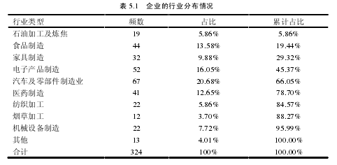 本研究大样本调查的正式问卷回收后共获得了有效样本 324 份。为了更清晰的展示样本的总体情况,本部分对研究的企业特征、个体特征和所有变量进行描述性统计分析。样本企业覆盖了东北地区、长江三角洲地区和珠江三角洲环的石油加工及炼焦业、食品制造、家具制造、电子产品制造、汽车及零部件制造、医药制造、纺织加工、烟草加工、机械设备制造等行业,基本上可以代表制造行业企业整体情况,具体分析情况如表 5.1 所示,汽车及零部件制造业占比最高为 20.68%,食品制造、电子产品制造、医药制造行业企业占比均超过了 10%以上,石油加工及炼焦、家具制造、纺织加工、烟草加工、机械设备制造行业企业占比均在 10%以下,其他行业企业占比 4.01%。 员工人数是管理学研究领域对企业行为有重要影响的企业特征之一,是反映企业规模的重要指标。如表 5.2 所示,研究样本具有较大的分散性。在企业规模分布上,100 人以下占 10.80%,101-500 人占 17.59%,501-1000 人占 38.27%,1000 人以上占 33.33%。
