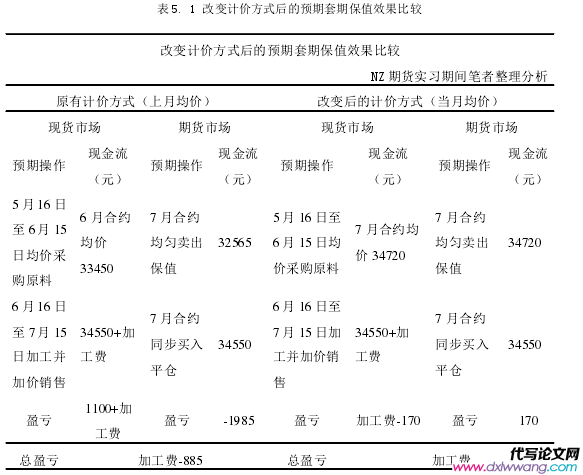 反向基差下一旦出现跨月的原料采购和产品销售,那么就会因为跨月,而出现换月基差损失,当跨月的时间越长,该换月基差产生的损失也就越多。NZ 期货公司的行业客户中,大部分都有较长的加工工期,因此在销售过程中,难免会发生跨月或间隔的情况出现,针对这部分行业客户,在进行套期保值时,必须做好充分的承担换月基差损失的准备。为了解决这个问题,笔者通过与研发部同事、加工周期较长行业机构客户调研分析,整理出优化的思路。首先,必须对期货的计价期进行有效的调整,保障产品销售计价期和原料采购的计价期趋同。当 NZ 期货公司的某客户在采购原料时习惯通过上月均价来采购,加入其产品加工时间为15 天,那么其保值周期一般为 45 天,从这里来计算,该企业的产品加工不可避免会出现跨月的现象。如果在卖出该企业的保值时,按照计价期均匀出售,该客户就会因为产品加工周期跨月而产生极大的损失。NZ期货公司建议该客户将原有的上月均价计价模式改为当月均价计价,通过这种结算方式,就能够避免因为产品加工周期跨越而产生基差损失。举例预期效果如表 5.1所示。在存在反向基差的条件下,发货时间、计价期以及库存等都会对企业的保值效果产生较大的影响,尤其是发货时间,一旦出现问题,将会导致隔月基差损失的扩大,隔月基差还会将运作过程中每一个部分同步扩大。在客户的实际经营过程中,为了回避基差带来的损失,甚至获取稳定套利收益,要尽可能的对原材料以及产品的发货时间进行协调。例如,NZ 期货公司的某铜业客户,在采购铜杆时是按照自然月的均价来计算的,在盘点销售价格时,是按照当天的盘面价出售的。从该企业的保值计划来看,只要保证在点价时,企业同时购入保值就能够有效的避免基差损失。但是这仅仅是从理论角度来看的,实际上,企业并不能保障自己的发货期与采购月保值一致,因此保值效果一直较差。
