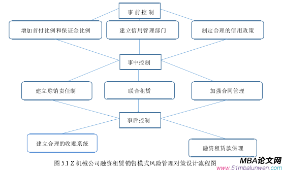 从以上对 Z 机械公司融资租赁销售模式的风险识别和原因分析,笔者发现,Z 机械公司主要在融资租赁业务的流程中的风险管理做的不到位,Z 机械公司已经采用了提高首付款比例、联合租赁和融资租赁款保理的风险管理措施,这几项措施有一定的效果,但仍然不够完善。以下就 Z 机械公司融资租赁业务的事前、事中和事后的风险管理提出较为完整的对策。