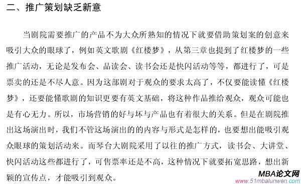 目前国内的剧院行业发展迅速,各地都在积极新建大剧院,虽然各方面都在往国际水平方向靠拢,但是在经营管理方面还是处于摸索、自我完善的状态。同样琴台大剧院在市场营销中也存在着若干问题。当剧院需要推广的产品不为大众所熟知的情况下就要借助策划案的创意来吸引大众的眼球了,例如英文歌剧《红楼梦》,从第三章也提到了红楼梦的一些推广活动,无论是发布会、品读会、读书会还是快闪活动等等,都进行了,可是票卖的还是不尽人意。因为这部剧对于观众的要求太高了,不仅要能读懂《红楼梦》,还要能懂歌剧的知识更要有英文基础,将这种作品推给观众,观众可能也是有心无力。所以,市场营销的好与坏与产品也有着很大的关系。但是在剧院推出这场演出时,我们不管这场演出的的内容与形式是怎样的,也要想出能吸引观众眼球的策划活动来。而琴台大剧院采用了以往的推广方式,读书会、大讲堂、快闪活动这些都进行了,可售票率还是不高,这种情况下就要拓宽思路,想出新颖的宣传点,才能吸引到观众。