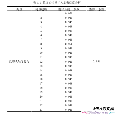 为保证论文的严谨,在对数据进行回归分析之前,对量表测得的数据进行信度与效度的检验,下面分别对教练式领导行为、情感承诺、员工工作倦怠进行信效度的测量。效度是指是否正确的测量得到了想要测量的概念,包含内容效度和构念效度。内容效度指题目的设定是否有代表性,对实际情况的测量效果;构念效度指获取的结果与量表的理论设计是否契合。本文的量表均是成熟量表,在国内外的实证研究中均有使用,可以表现出合理的内容效度。本文采用探索性因子分析的方法来测量构念效度,结合 KMO 指和 Bartlett 球形检验以及总变量解释率来进行效度分析。