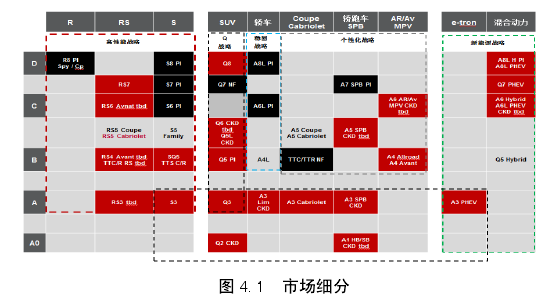 目前中国汽车市场主要分为超豪华车市场,如保时捷,宾利,玛莎拉蒂等;豪华车市场,主流品牌有奥迪,宝马,奔驰,路虎,沃尔沃等;以及普通乘用车市场,大众,丰田,起亚等,以及众多国产车品牌如奇瑞,吉利,长城等。市场细分通常按照用户群体来划分,而在汽车市场,不同的车辆级别和车身概念正是由不同的用户群来划分的,举例来说,A级别的用户可能个性时尚,年龄很小,追求潮流与个性;而D级别的用户则多稳重大气,是成功人士的首选。奥迪属于豪华车市场,将这一市场按照车辆级别以及车身概念来进行市场细分,在车辆级别中如要以车辆的轴距尺寸作为衡量标准,从A0级别一直到D级别,而从车身概念进行细分,有SUV车型,轿车车型,Coupe/Cabriolet车型,Sportback轿跑车车型,Allroad/Avant旅行车,以及代表新能源的电动车车型和混合动力,以及高性能车型,对应的车辆级别与对应的车身概念相结合,即为某个车型所属的细分市场。举例来说,豪华A级别细分市场,主要由奥迪A3,宝马1系,奔驰A级别进行竞争;以及豪华D级别细分市场,主要代表产品奥迪A8,宝马7系,奔驰S级别;同样SUV市场也以A、B、C、D级别划分,如豪华C级别SUV市场,主要竞品为奥迪Q7,宝马X5,奔驰GLE;而像奥迪A5Coupe车型,从车身级别上属于B级车,从车身概念属于Coupe概念,则A5Coupe车型则属于B级Coupe细分市场(如下图所示)。