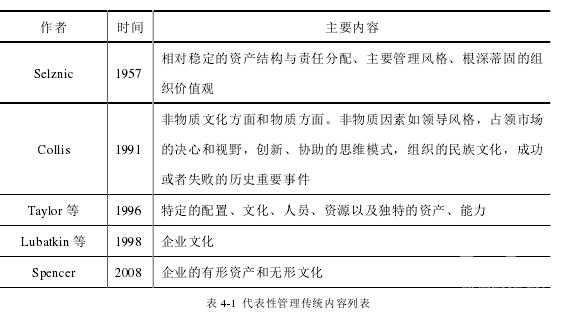 本文基于对国内外管理传统的相关文献的梳理和研究,尝试构建企业管理传统理论的初步框架。早在 1930 年,Leonard 便提出了管理传统(Administrative Heritage)的概念在六十年代以前,已有多位学者谈及、运用管理传统这一概念,并已开始讨论管理传统对企业决策、战略选择、组织结构等方面的作用。而国内对于管理传统的研究起步较晚,一直到九十年代中期才有学者提及管理传统的概念。通过文献研究,笔者明确企业管理传统理论的发展经历了三个阶段:经历了形成阶段(1930-1962)、缓慢发展阶段(1962-1980)、快速、多角度发展阶段(1989 至今)的三个过程,目前仍缺乏统一、完整的理论框架。企业的管理传统是指企业所积累的,指导企业具体实践的逻辑和经验。其内容包括组织历史、核心价值观、原则和规范、管理实践、企业文化等方面的内容。企业管理传统具体包括企业文化、组织历史、核心价值观、战略思维模式、企业管理模式等。