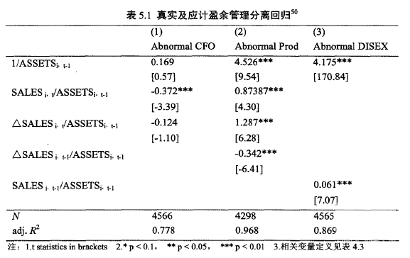 如表5.1所示,对于模型(1)至模型(3),本文釆取了分年度分行业回归,由于受到本文的篇幅影响,所以只报告了全样本回归的结果。如表所示,异常经营现金流(Abnormal CFO)分离模型、异常生产成本(Abnormal Prod)以及异常可操作费用(Abnormal DISEX)三个分离模型修正后的R-square,分别高达0.778、0.968及0.869,说明本文的模型中解释变量可以很好的解释正常范围内经营现金流、生产成本及可操控费用水平或规模,都具有很高的拟合优度。同时,相关系数显著性值都较高,部分相关系数显著水平高达1%,这说明Roychowdhury (2006)的模型可以通过回归检验,对我国上市公司也具有较强的适用性。