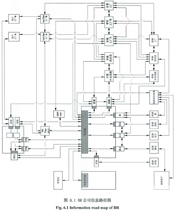 如图中所示整个供应链体系都被涵盖在整张图中。从纵向角度看这张图包括了从下游的客户,一阶供应商到BR公司项目团队到下游供应商。从横向角度看客户端包括中国客户和欧洲客户以及相应的总装厂,BR公司同样也包括中国项目组、欧洲协调人和相应的工厂,同时还包括了平行的其他项目和数据系统。另外这幅图还表明了项目组织的构成关系,比如图中的中国项目组就是有项目经理、销售、质量、IE、设计、测试、物流以及釆购等等的职能部门成员组成的。图中的每一条连线都代表了一个业务关系,在每个业务关系的两端就是项目干系人(这里SAP系统也属于项目干系人)。根据这些连线就可以识别到对应的项目干系人,根据每条信息路线又可以确定出具体的业务流程。