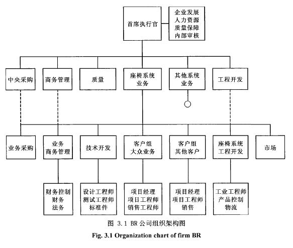 公司由首席执行官,业务单元副总/中央职能部门副总,客户组总监/部门经理和职员四个管理层次构成。其中业务单元和中央职能部门属于平行关系,业务单元下设有客户组,客户组的组织形式为项目团队形式,属于弱矩阵架构。BR公司组织架构如图3.1所示: