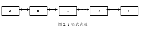 由上图可见,链式沟通中信息是由上向下逐级传递的,传递过程中不能越级,不能出现横向传递的现象。“牛鞭效应”是这种沟通最明显的体现,现代企业管理对此种沟通大为诟病,但有时那些大型企业迫于层级多的问题,授权下属机构利用链式沟通进行分别化、独立化管理也存在较好的可行性。