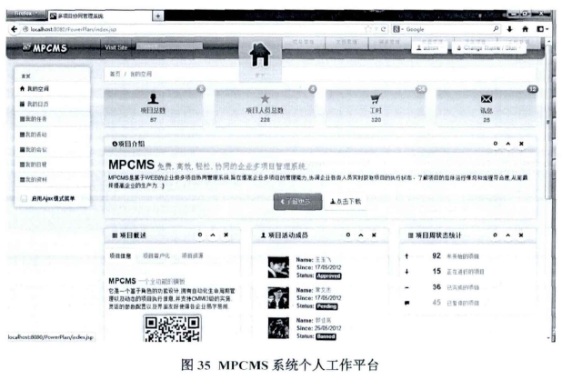 图35显示了 MPCMS系统在登录系统后的ft页面。个人工作平台下所显示 的模块分两类,一类是每个用户默认都打的,如通知公告、工程安排(与MPCMS系统里而的个人汁划相关联)、活动项目成员等;另一类则足根据该用户角色所赋予的权限动读取出来的,如系统菜单和系统列农等,这两类部件都可通过鼠标选中拖动进行重新布局。