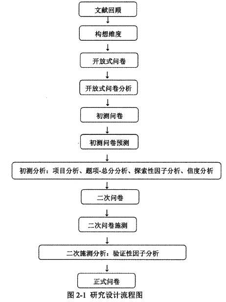 文献回顾国内外相关领导力的思想、理论,以及开放式问卷收集大学生领导力的表现形式,提取出相关的题项,构成大学生领导力初步问卷。通过对问卷的初步施测和对测量结果统计,确定大学生领导力结构,并形成正式问卷。最后,正式施测,分析了解大学生领导力的现状。详细研究设计见下图2-1。