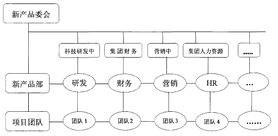 华羚集团为了保证实现突破发展瓶颈的经营目标,为藏地益宝蛋白质粉的开发上市建立了专门的新产品开发组织,该组织属于矩阵式组织结构,主要包括新产品委员会、新产品部和项目团队,各部门的成员是由集团各职能部门抽调的员工,上至高层管理者,下至基层生产工人,组成新的组织为藏地益宝开发上市服务。具体组织结构图如下: