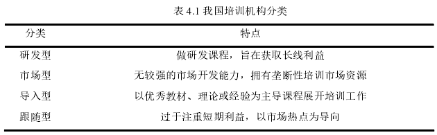 现阶段,我国培训机构主要可以分为四种类型,相关情况见表 4.1: