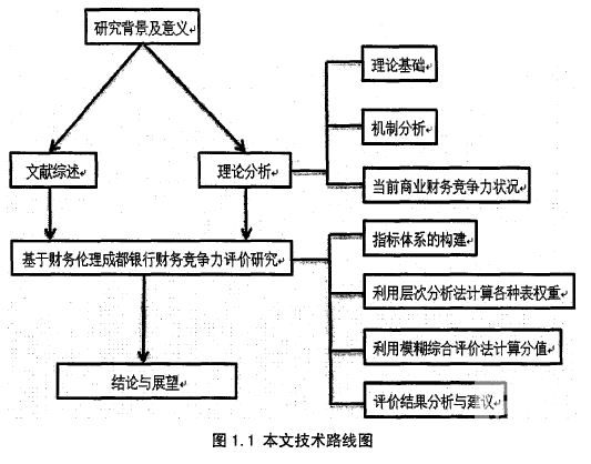 本文的研究思路是在对相关文献进行归纳梳理的基础上,提出本文的研究方向。本文在对理论进行分析的基础上,构建了基于财务伦理的商业银行财务竞争力评价指标体系,基于层次分析法以成都银行为例进行了研究,最后提出对策及建议以及后期研究展望,本文研究思路如下图1.1所示: