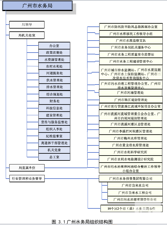 广州市水务局隶属于广州市政府,是市政府主管全市水行政的工作机构。广州市水务局内设 14 个职能处室,19 个直属单位,13 个行业管理和业务督导单位。广州市水务局的组织结构受外部环境的影响以及内部创新管理需要,组织架构以及职责会不断的进行调整,如 2008 年初,水务局进行大的机构重组,新增供排水管理业务,相应的也增加了对应的处室。2008 年 12 月 16 日,广州市水务投资集团有限公司正式挂牌成立,原属水务局管理的下属单位:广州市自来水公司(简称“自来水公司”)、广州市自来水工程公司、广州市污水治理有限责任公司划归水投集团,水务局负责行业管理及业务督导。可以看出整个水务系统组织、业务都会经常调整 ,目前组织架构如图 3.1 所示,主要包括局处室及下属单位。