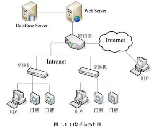 由系统网络结构可知道,门禁系统通过 IP 分配直接连接到交换机上. 学生数据初始化时,由门禁系统通过门禁信息输入设备读入欲进入宿舍的学生信息,再通过接口操作界面输入对应学生的学号、姓名、宿舍楼号和宿舍号,从而组成一个完整的学生信息数据表,保存在整个系统的数据库中. 当系统启用门禁系统,学生进行操作后,门禁系统输入设备会读取学生的证件信息,通过网络把处理后的信息编码提交给 Web 服务器,由 Web 服务器通过表单的提交和数据库交互处理,然后根据要求实现是否返回处理结果来给门禁加电的整个操作.整个指纹读取响应处理时间约 3 秒,如该幢学生宿舍人数较多,可以考虑多放置几台门禁系统。