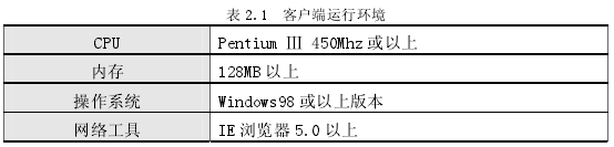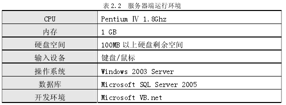 本系统是以 Windows 系统为操作平台,用 VB.net 编程语言做网页界面,同时用脚本语言做网页界面与底层数据库的互联,用 SQL Server 数据库来实现高等职业卫生学校学生宿舍管理系统所需功能的。同时,在系统的开发中,我们充分考虑到有些高等职业卫生学校由于在终端资金的投入等诸多因素,因此在硬件要求上不做苛刻要求,具体运行环境见表 2.1 及2.2。