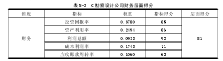 本文指标数据主要取自于 C 勘察设计公司 2014 年度财务报表、主要业绩评价指标表及其相关内部资料,其中客户满意度、企业美誉度和职工幸福度三项指标数值通过调查问卷法取得,此问卷(见附录 2)共发放 70 份,收回 60 份,其中有效问卷 45 份。通过计算,由表 5-2 可以看出,C 勘察设计公司财务层面最终得分为 81,落在良好区域,说明 C 勘察设计公司的财务状况良好,财务层面的战略目标取得了不错的进展,但从上述业绩等级划分的区域来看,C 勘察设计公司财务层面的业绩刚刚达到良好的标准,距离优秀还有不小的差距,仍然有努力提高的空间。本文中 C 勘察设计公司财务层面的战略目标包括增加股东价值,优化资产配置,提高获利能力,加速资金周转。从表 5-2 各指标的权重值可以看出,这其中尤以增加股东价值这一目标最为重要,而此项目标的最终得分为 85,高于整个财务层面的综合业绩,而之所以出现这样的结果主要是由于 C 勘察设计公司在加速资金周转方面的得分比较低,只有 63,从而降低了财务层面的业绩水平。从表 5-2 中我们还可以看出 C 勘察设计公司在提高获利能力方面,虽然利润总额目标得分 92,但是其成本利润率指标得分只有71,这说明 C 勘察设计公司只注重对利润绝对额的追求,日常管理过程中却忽略了成本的控制工作,这将导致空有大规模,难有高效益。