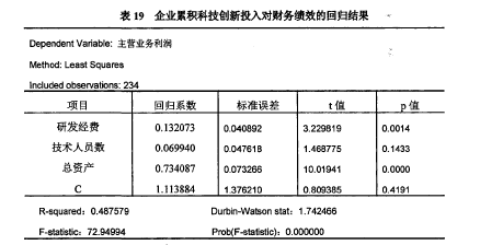 (2)科技创新投入与企业财务绩效之间存在显著的正相关关系,科技创新投入有利于企业绩效的提升。科技创新投入直接的成果是产生新工艺,获得新专利技术等,但是这些新工艺、性的专利技术能够提升生产要素的利用效率,减少浪费,提高产量;同时,新技术的采用也会降低成本,打通销售渠道,提高销量,提高市场占有率。本文以主营业务利润率、总资产周转率、资产负债率和净利润增长率作为被解释变量,分别代表企业的收益绩效、营运绩效、偿债绩效和成长绩效。通过实证研究得知,科技创新投入与企业财务绩效呈显著正相关关系,对企业的经济效益具有正向促进作用。