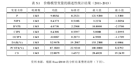 由于相关准则至今仍在修改完善中,本文选取了 2011-2013 年沪市上市公司作为研究样本,为评价综合收益理念的阶段性应用效果提供信息反馈。本文所使用的样本数据取自 Wind 资讯金融数据库,根据研究目的进行如下样本剔除工作:第一,由于 B 股和境外上市公司的相关信息较难获取,本文将沪市 A 股上市公司作为研究对象;第二,由于金融行业的经营业务显著异于其他行业,将来自该类企业的样本数据剔除;第三,由于本文的研究对象是综合收益信息,因此剔除“其他综合收益”为零、相关信息未予列示或显著异常的上市公司样本;第四,由于审计意见为非标准无保留的上市公司财务报表数据有失公允,将此类样本剔除;第五,剔除 ST、*ST 等非正常交易状态的公司样本以避免异常数据的干扰。根据以上筛选原则,本文最终选定:价格模型中总计 1345 个样本,其中 2011年度 427 个,2012 年度 457 个,2013 年度 461 个。报酬模型中总计 1317 个样本,其中 2011 年度 412 个,2012 年度 445 个,2013 年度 460 个。研究使用了 Excel 2010进行基础数据处理并获取描述性统计结果,多元回归分析工作使用 Eviews 6.0 统计分析软件完成。
