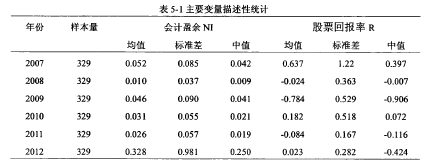 主要变量分年度的描述性统计如表5-1所示,可以看出:(1)会计盈余各年的巾值均小于均值,表示NI是右偏的;(2)股票回报率各年的中值也是小于均值的,表示股票回报率也是右偏;(3)同一年度来看,2007年会计盈余的标准差0.085小于股票回报率的标准差1.22; 2008年会计盈余的标准差0.037小于股票冋报率的标准差0.363;2009年会计盈余的标准差0.090小于股票回报率的标准差0.529; 2010年会计盈余的标准差0.055小于股票回报率的标准差0.518; 2011年会计盈余的标准差0.057小于股票回报率的标准差0.167;只有2012年会计盈余的标准差0.918小于股票回报率的标准差0.282:说明相对丁?会计盈余来说,股票回报率的波动性更大。图5-1显示了会计盈余和股票收益率2007-2012年度趋势图。图中显示,股票收益率有较大波动2007年为最高点为0.637,然后一路下滑,跌至2009年的谷底-0.784后开始回升,但一直处于波动状态。上市公司会计盈余较为稳定,2007-2011年比较平稳,2012年升至趋势由2011年的0.026升至2012年的0.328。