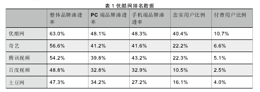 据中国互联网信息中心发布的《第 35 次中国互联网络发展状况统计报告》,截至2014 年 12 月,中国网民规模达 6.49 亿,其中网络视频用户规模达 4.33 亿,网络视频用户使用率为 66.7%。网络视频用户每天在网络视频上投入较大比例的时间,80%以上的视频用户收看视频节目的日均时长高于 30 分钟,而 32.4%的电脑用户和 20.9%的平板电脑用户收看网络视频的时长高达 2 小时以上。1另据艾瑞数据统计,截止到 2012 年 5 月,中国在线视频用户规模首次超越搜索服务跃居第一,继时长份额居首后又成为覆盖最多网民的网络服务,网络在线视频成为互联网第一大应用2。诸多统计数据强调了网络视频行业的重要地位,可以说视频网站的发展方向很大程度上决定着中国互联网将何去何从。在这一背景下,对中国视频网站的研究将为了解中国互联网前景提供启示。2014 年被业内定义为为“自制元年”。在经历了 UGC(User GeneratedContent,用户制作内容)视频分享模式、购买电视台剧目版权的 PGC(Professional Generated Content,专业制作内容)模式后,国内主流视频网站纷纷将目光转向自制节目。若想在众多同质化的竞争者中抢占先机,塑造鲜明的品牌形象,视频网站必须生产带有自身鲜明烙印的自制内容。以《晓说》、《老男孩》、《屌丝男士》等剧为代表的自制节目不断将收视率推向高潮,充分展现了网络自制节目的发展潜力。《第 35 次中国互联网络发展状况统计报告》指出,内容依然是视频网站的核心竞争力,视频网站的发展始终依托于高质量、差异化的自制内容。在这一背景下自制战略将持续成为视频厂商的重要着力点。自 2004 年网络视频进入中国,历经 10 余年的市场竞争与行业内部整合,网络视频行业迅速发展并成熟,其竞争格局基本达到了稳定。优酷、土豆、奇艺等视频网站逐渐成为行业强势公司并垄断国内网络视频行业。优酷网凭借其整合专业影视节目、自制节目和 UGC 内容的优势,占据了网络视频行业的头把交椅,其整体品牌渗透率、忠实用户比例和付费用户比例上均遥遥领先于其他视频网站,可以说代表了中国视频网站的最高水平。然而中国的视频网站发展虽快,但毕竟起步时间晚,尚未成熟,当 UGC 模式和PGC 模式都无法进一步满足视频用户多样化、高要求的观看习惯时,优酷网开始尝试自制内容以寻求新的发展方向。本文分析优酷的自制内容,审视中国视频网站自制内容存在的问题,并探寻解决策略,对其未来发展前景提出思考和建议。