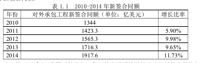 作为对“走出去”的战略的响应,我国的很多企业加快了国际化的进程,作为这些企业中的重要部分,我国的建筑企业也加入了向海外扩张的队伍,进入了承包国际工程在国外进行施工这一新的领域。在海外扩张的过程中,我国的建筑企业取得了巨大的成就,这是有目共睹的。对于企业来说,最大的肯定来自于市场,市场的扩大代表了企业发展的成功,而建筑企业的市场最好的指示器就是每年的新签合同额。下表显示的是 2010-2014 年这五年我国建筑企业在海外市场的每年新签合同额:由表格可以看出,我国对外承包工程新签合同额的增长速度呈现越来越快的势头,2014 年的增长比率已经超过了 10%,这意味着我国的建筑企业在海外市场承包的项目在逐年快速递增。 虽然我国建筑企业向海外扩张的速度很快,但是不可否认的是扩张的道路并不是一帆风顺的,在这一过程之中很多建筑企业也遇到了许多意料不到的问题,导致在国际工程承包的发展上受到了很大的挫折,以下试举几个例子来说明。 中国铁建股份有限公司于 2009 年 2 月 10 日签署了沙特麦加萨法至穆戈达莎轻轨项目的承包合同,随后该项目巨亏 41.48 亿元人民币。中国中铁下属的中海外和中铁隧道与上海建工集团和波兰德科玛有限公司组成的联营体于 2009 年 9 月中标波兰 A2 高速公路 A 和 C 标段,随后由于项目亏损于 2011 年 6 月 9 日终止合同,业主提出了 17.51 亿元人民币的索赔,目前诉讼仍在进行中,最终损失不得而知。 中国建筑企业在利比亚承接了大量的项目,2011 年由于战争全部撤出利比亚,进行中的项目半途而废工程款难以回收,物资设备的损失也无法估量。 上述的例子只是发生在国际工程承包中涉及金额较大的事件,而在大量的项目中类似的情况还有很多,仅仅因为没有引起媒体的关注而被大众忽视,但是这些问题已经对中国建筑企业的海外扩张造成了负面的影响,需要采取措施来解决。