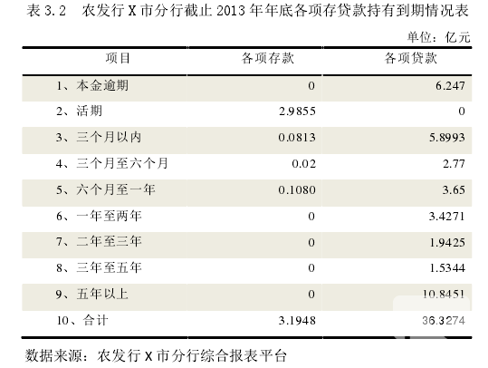 X 市位于我国中部,地属黄土高原,属欠发达地区,辖内共有县、市区 10 余个,总面积 2.5 万平方公里,地形以丘陵、山地为主,其中耕地面积为 974 万亩。全市总人口为 310 万,其中农村人口 215 万。该市市区及周边两县地属盆地,是该省粮食主产区之一,其中玉米产量占全市粮食总产量的四分之三,其余县则均为山地、丘陵,多以小杂粮种植为主。同时该市西部四县羊养殖在附近区域内较为出名,羊年出栏近150 余万只,除满足辖内羊肉需求外,多销往外地。虽然 X 市近年来经济发展增速较快,高于其所在省平均水平,但由于基础弱,基数小,因此整体经济发展水平在全省排名垫后。2013 年,X 市地区生产总值完成 654.7亿元,同比增长 9%,总量仅占到全省的 5%;财政总收入完成 144.1 亿元,同比下降0.1%,其中公共财政预算收入完成 73.7 亿元,同比增长 13.1%;财政收入总量在全省位列倒数第三,其中公共财政预算收入仅占到全省总量的 4%;城镇居民人均可支配收入 20324 元,同比增长 9.9%,农民人均纯收入 5423 元,同比增长 13.6%,总量处在全省末位。X 市也是全国较为贫困的地区之一,其所辖县、市中有 11 个属国家扶贫开发重点县。农发行 X 市分行于 1996 年 12 月从该市农行划分出来,成为了该市唯一一家农业政策性银行,成立之初全行职工人数为 212 人,目前正式职工 204 人。中共党员 139名,占比为 68.1%;男女职工比例基本持平;从学历构成上看,具有大专及以上学历的为 162 人,占比 76%,具有硕士学历的仅为 5 人,占比为 2.4%;全辖员工平均年龄42.7 岁,其中 50 岁以上 56 人,占 27.5%;30 岁以下 61 人,占 29.9%,其中近 4 年招录本科及以上学历人员共计 26 人,极大的改善了该行的年龄结构和学历机构。
