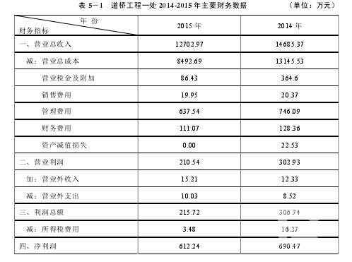 EVA 的计算旨在基于企业投入的资本存在成本的这一假设前提下,更加准确的反应一个企业的经营、财务状况。本章所使用的该公司报表数据来源于中原建设工程公司的内部有关资料,下面以中原建设工程公司下属二级单位道桥工程一处为例进行 EVA 的有关计算,该单位 2014-2015 年财务数据资料如表 5-1 所示:债务资本成本:因中原建设工程公司隶属中石化石油工程建设公司,中石化全面实行资金集中管理,禁止下属单位进行外部筹融资,仅允许通过集团内部申请贷款,故本文借款利息率采用中石化内部贷款利率 4.8%来研究。权益资本成本:采用风险溢价定价模型。我国的市场风险溢价大约为 3%-5%,本文选择 4%作为风险溢价,这个数值的选取不会影响 EVA 指标的反映能力。根据资本资产定价模型(CAPM)本文根据中原建设工程公司道桥工程一处 2014-2015 年财务数据为例,依照此方法,分别对中原建设工程公司其他 12 家二级单位的指标进行计算,得出 EVA 后,将其与同年净利润进行比较,由表可知,从 EVA 角度来看,中原建设工程公司所有二级单位近两年的 EVA 均大于 0,说明企业的预期收益高于所投入的资本,经营者为企业创造了财富。但是在 12 家单位中的 9 家单位 2015 年 EVA 数据比 2014 年均有所下降,平均下降幅度经测算约为24.8%,说明企业对于资金的使用效率在降低。究其原因,一方面是受近两年国际石油行业效益普遍不佳,石油企业进入寒冬期,石油石化产能萎缩,加之施工队伍有增无减,造成市场竞争激烈,开发难度加大,中标率低,总体业绩下滑。另一方面,为应对市场的寒冬期,公司在市场开发费用及项目前期成本的投入增加。从表中还可以看出,虽然2015 年整体净利润较 2014 年下降不是很明显,但是 EVA 波动较大,说明企业在保证利润的前提下,投入的资本却有着大幅增加。这样的差别显示了净利润与 EVA 对企业经营状况的解释不同,EVA 剔除了一些非经营项目与资本占用对企业的影响,最大程度上还原了企业真实的经营状况,因此与利润为导向的业绩考核标准有着很大区别。在计算过程中合理调整了会计报表中的一些项目,充分考虑了股权资本成本对企业价值的影响,与净利润指标相比,在衡量企业的价值创造能力和经营业绩时更为准确全面。