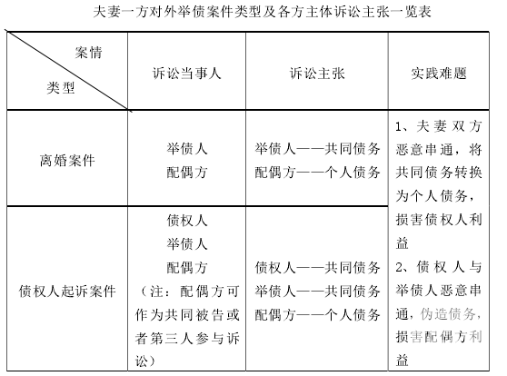 根据以上典型案例分析可知,夫妻一方对外举债在实践中主要表现为以下两种形式:其一,在离婚案件中,夫或者妻一方提出其曾在婚姻关系存续期间甚至是婚前以个人名义对外借贷,但实际借款的资金用于共同生活,请求法院确认该笔债务性质为共同债务,如上文的【案例一】和【案例二】。不言而喻,在离婚案件中仅涉及到两方诉讼当事人即举债人和其配偶方;其二,债权人凭借借款合同,起诉夫妻中举债方或者配偶双方,请求举债方或者配偶双方共同承担债务偿还责任,上文中的【案例三】和【案例四】便是如此。在此类案件中,就诉讼主体而言,囊括了作为原告的债权人和作为被告的举债人,同时在此类案件中,债务性质的认定和清偿直接关乎配偶方的利益,故而配偶方往往以共同被告或者第三人的身份“出席”。笔者以表格形式对以上情形做一梳理,期望“以共同特征建立之类型,其规范或多或少具有相似性,故而可以触类旁通,帮助了解或解释法律的道理。”① 人都是理性的经济个人,此表同样是建立在人们普遍追求自身利益实现、规避债务风险的基础上。因此在此表中,债权人就夫或妻一方对外举债所负债务主张权利的,基于债权利益最大化的考量,必然的诉讼主张是请求认定债务性质属共同债务,以获得夫妻双方共同承担连带清偿责任之效果。而就未举债的配偶方而言,受机会主义的驱动,本着天然规避风险、逃避债务的心理,其诉讼主张均为个人债务,如此情况下的诉讼请求对抗便能产生不小的纷争。加之【案例四】中夫妻双方恶意串通以假离婚之形式,意欲将共同债务转换为个人债务,损害债权人利益和债权人与举债人恶意串通伪造债务,损害配偶方利益这两种极端情形,使得夫妻一方对外举债的案情复杂程度进一步升级,处理难度也愈加增强。而且,司法实践中不同裁判标准的适用使得上述纠纷的解决更是雪上加霜,故而难以准确界定债务性质。