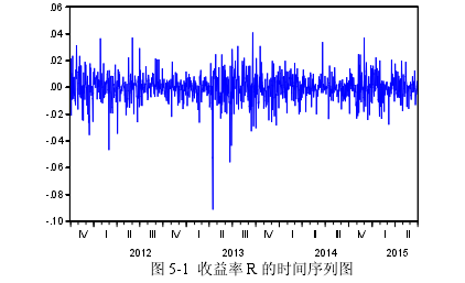 本文采用的数据是伦敦黄金现货每日收盘价格。数据区间为紫金矿业收购左岸金矿项目后的时期至今,即紫金矿业持有该项目的时间 2011/09/29 日到 2016/05/02 日,扣除非营业日,共有 1165 个数据。其中选取 2011/09/29-2015/06/30 日共 977 个数据,用于构建 GARCH-Va R 模型和确定模型的估计参数,剩余 2015/06/30-2016/05/02 日的共 219 个数据,用于检验构建的 GARCH-Va R 模型的有效性。数据来源是大智慧软件。采用 Eviews8.0 软件对数据进行处理。采用 Eviews 软件计算得出黄金现货收益率序列如下图。从图中可以看出 LME 黄金现货收益率序列 R 的波动总体较为平稳,但是也可以经常观测到异常值的出现且次数较为频繁,可以认为该序列存在集聚性和爆发性,属于随机序列。对黄金现货收益率序列进行进一步处理,对数据的统计特征进行进一步观察。得到收益率的柱形统计图。从图中可以看出黄金现货的对数收益率序列的均值(mean)是-0.000327,标准差(Std.Dev.)是 0.010671。同时从收益率序列的偏度(Skewness)-0.904481,看出收益率序列有长的左拖尾。而峰度(Kurtosis)10.48776,大于 3,表明分布突起程度大于正态分布,说明该收益率序列的分布具有 “尖峰后尾”特征。J-B 统计检验得出该收益率序列拒绝服从正态分布的假设。