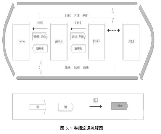 卷烟流通贯穿工业企业、商业企业、零售客户、消费者四个环节,主要包括商流、物流、资金流、信息流,四流相辅相成、相互作用,工商之间、批零之间四流汇通。商流以市场分析为起点,经需求预测、货源采购、工商配货、订单采集、终端推广等业务环节,形成营销业务循环;物流以货源采购为驱动,经卷烟调拨、工商在途、仓储分拣、终端配送、包装物回收等关键业务环节,形成物流业务主线;资金流主要是由工商交易、物流费用支出、商零交易产生的资金流动;信息流伴随商流、物流、资金流的各个环节,交织于商流、物流、资金流循环往复。烟草物流业务功能定位为:仓储分拣、终端配送和包装回收。具体包括统一收货、集中存储、分拣到户、直接或经中转配送到零售户,以及对仓储、分拣、配送信息进汇集、处理、分析、存储及传递。其流程主要由以下几个环节组成:1.工商配货:根据烟草公司营销部门采购信息,卷烟工业企业进行配货、调拨并送货到 F 烟草公司物流分公司。2.卷烟仓储:烟草公司物流分公司对卷烟进行卸货,验收、扫码、分配货位后入库;卷烟在库储存期间,做好商品养护及定期盘存工作,并做好记录,定期向营销部门传送卷烟库存信息。3.分拣配货:烟草公司营销部门汇总电话订货或网上订货的订单信息,传送到烟草物流分公司,烟草物流分公司依据订单信息生成备货策略和分拣策略,并实施分拣打码作业;同时对卷烟包装箱进行回收。4.批零送货:对于直送卷烟,直接执行送货任务并进行结算;对于中转卷烟,提前将卷烟送至中转站(对接点),验收交接后再实施二次配送(送达卷烟零售客户);送货完成后,汇总送货信息以供营销部门实施销售确认。5.退货:对卷烟零售客户拒签或要求退货的订单,进入退货环节,并将卷烟带回配送中心/物流分公司,盘点入库。